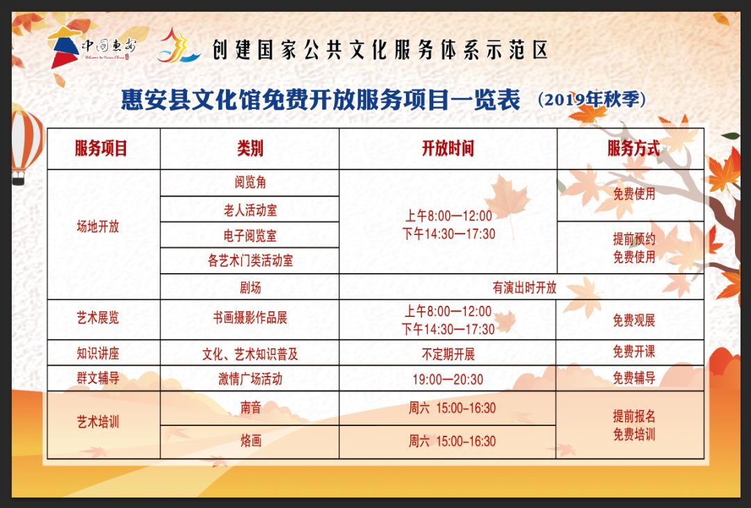 惠安县文化馆常年举办各类展览、讲座、培训;组织开展丰富多彩的、群众喜闻乐见的文化活动;开展流动文化服务;辅导和培训群众文艺骨干;组织并指导群众文艺创作;收集、整理、研究非物质文化遗产,开展非物质文化遗产的普查、展示、宣传活动,指导传承人开展传习活动等。现已成为我县群众文化活动的聚集区和中心点,通过多方面、深层次的免费开放项目和活动,较好地服务了县域群众和周边社区。