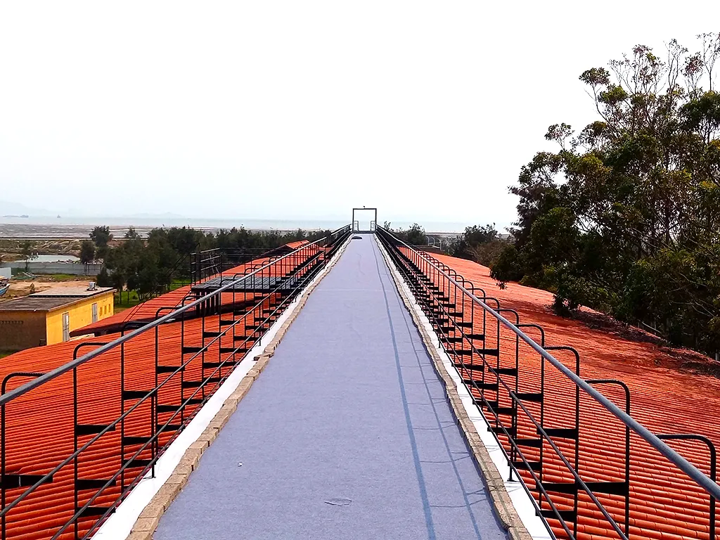 爬上屋顶的观海栈道,映入眼帘的是美术馆两侧屋顶上的“闽南红”瓦片,在碧海蓝天的衬托下显得一片红火,郁郁葱葱的绿树也来“凑热闹”。长长的栈道仿佛直通大海,走到尽头就是最佳观海点,来看看画展、吹吹海风、看看潮起潮落,将蓝天碧海尽收眼底吧!