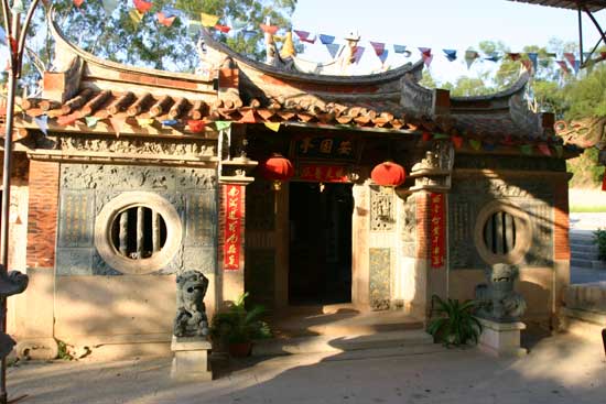安固石亭位于惠安县涂寨镇岩峰顶东山村东,建于北宋端拱年间(988~989年),为古道凉亭建筑。亭呈方型,坐北朝南,面阔3间(7.85米),进深3间(8.7米),由16根粗大的方型石柱架成,檐柱12根,边长0.4米,高2.4米。金檐柱间的四角以石斜梁相连,有栌斗,石板四坡顶。清光绪年间(1875~1908年)维修,加筑重檐歇山顶式屋盖,又扩建拜亭和山门,奉观音菩萨,遂变凉亭而为观音亭。