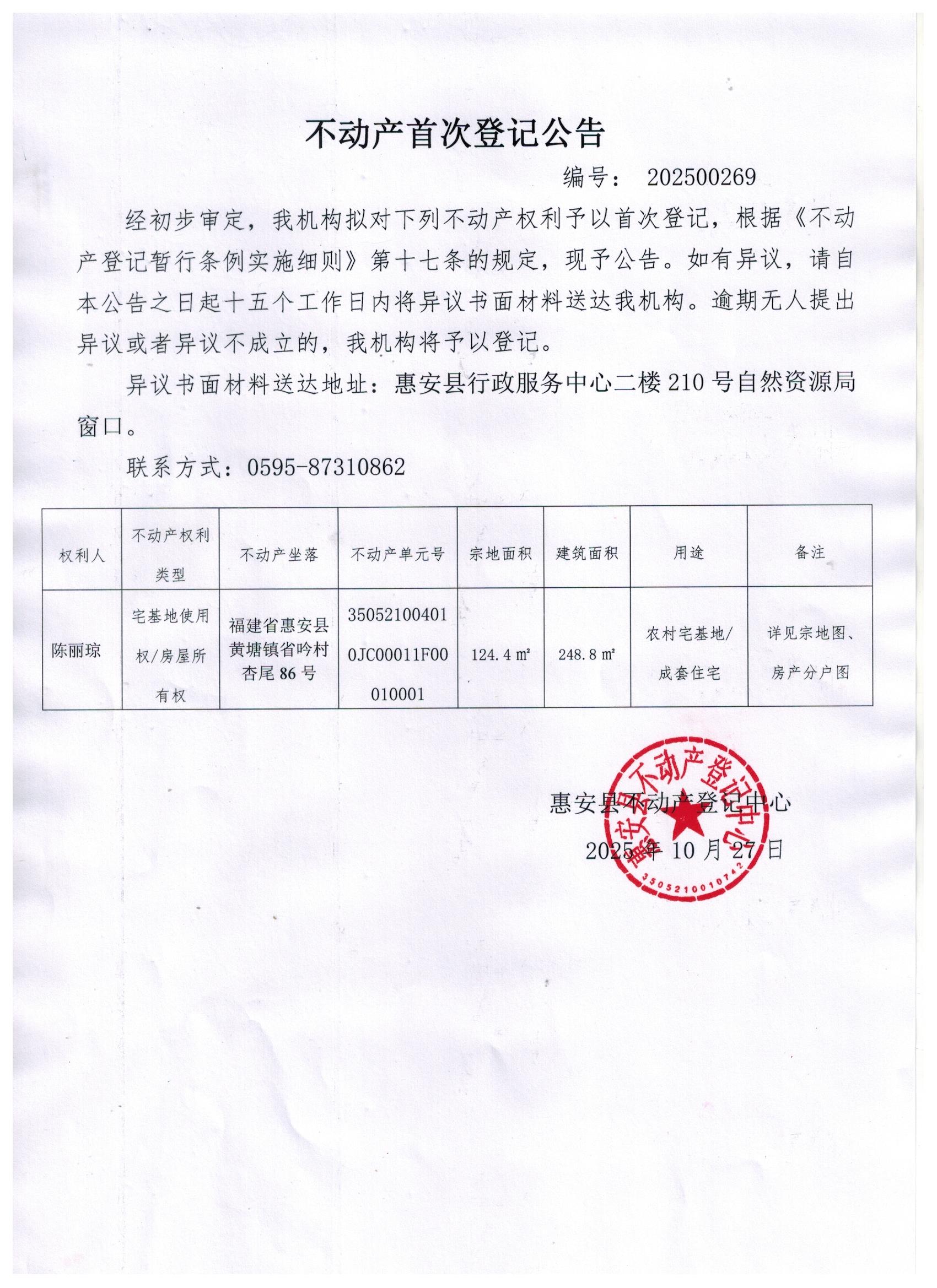 不动产首次登记公告202500269