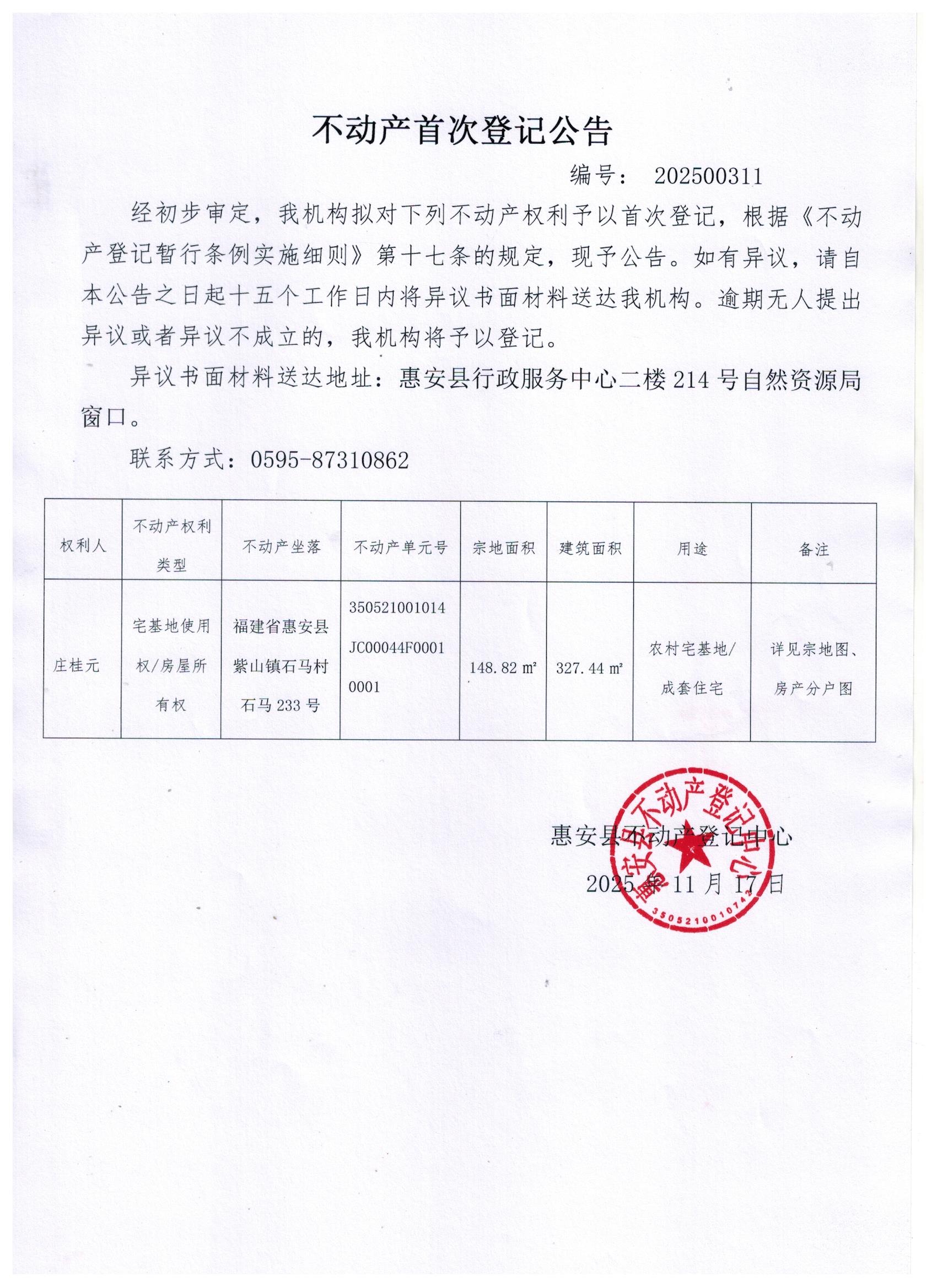 不动产首次登记公告202500311