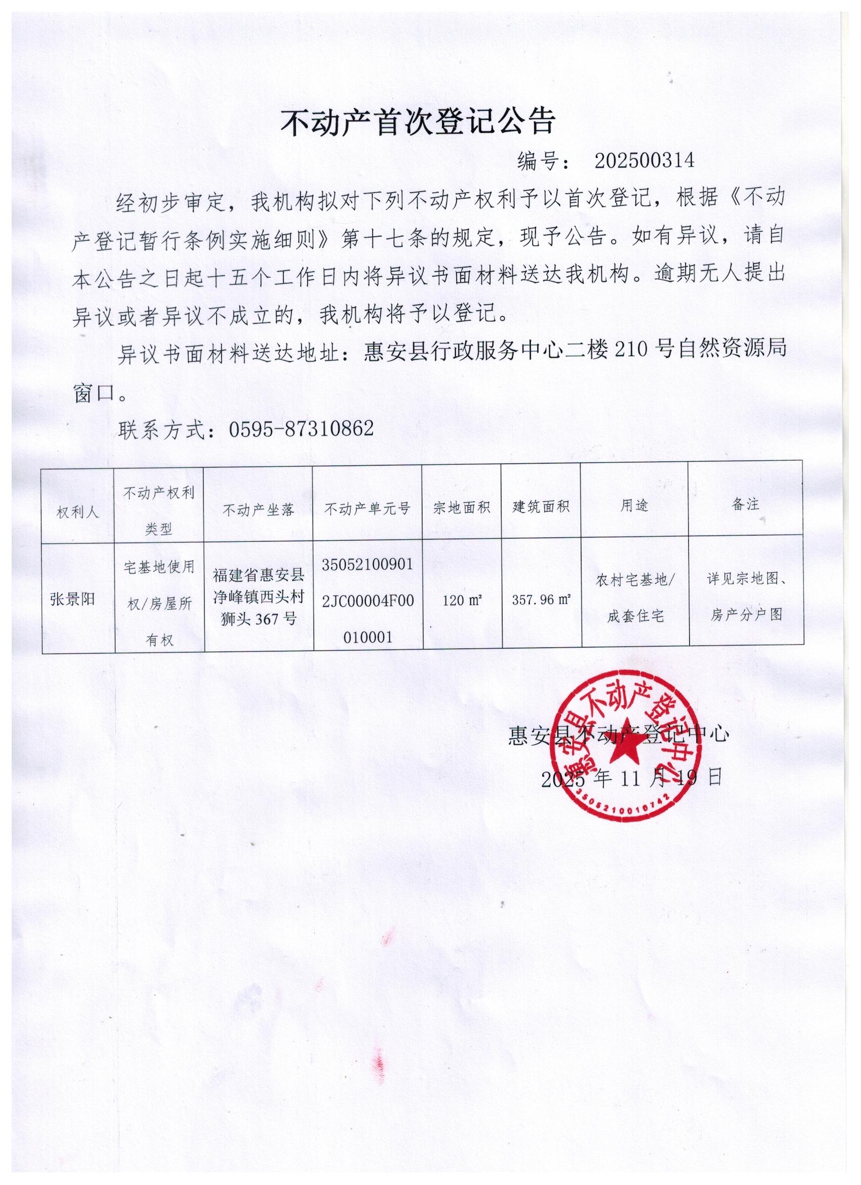 不动产首次登记公告202500314