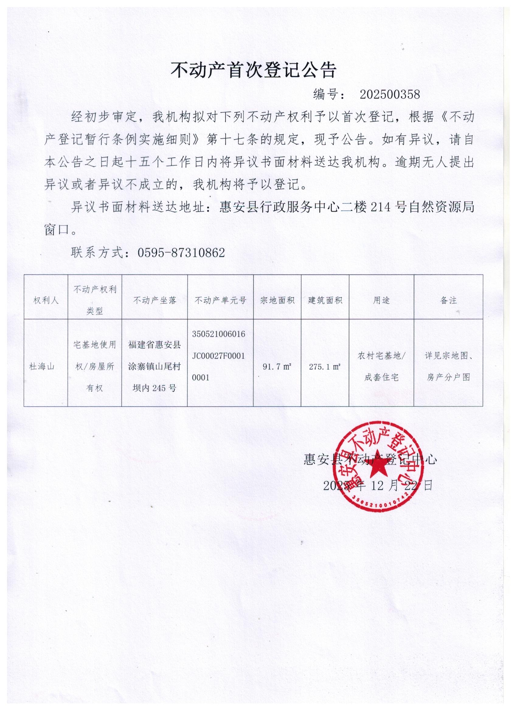 不动产首次登记公告202500358