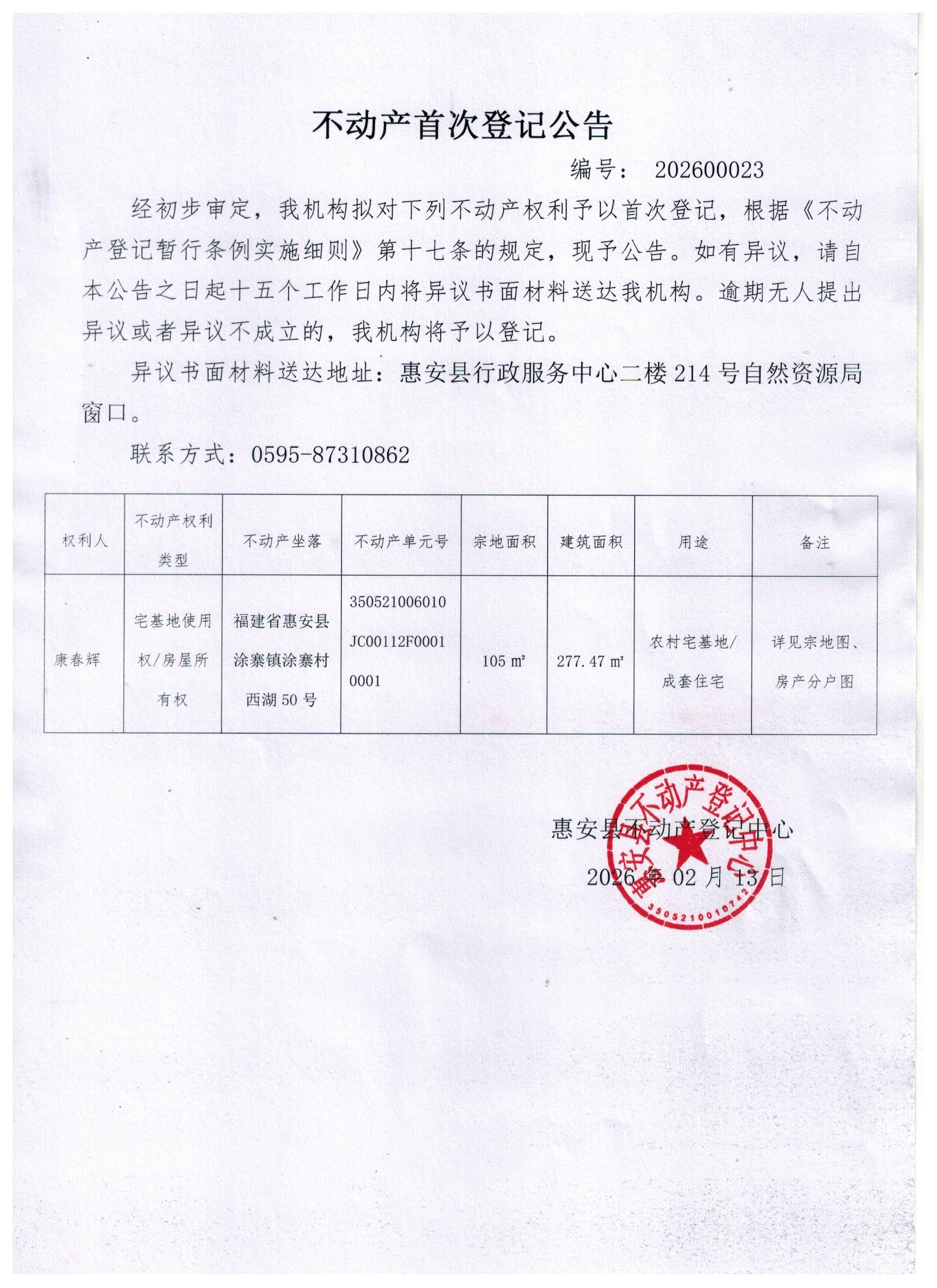 不动产首次登记公告202600023