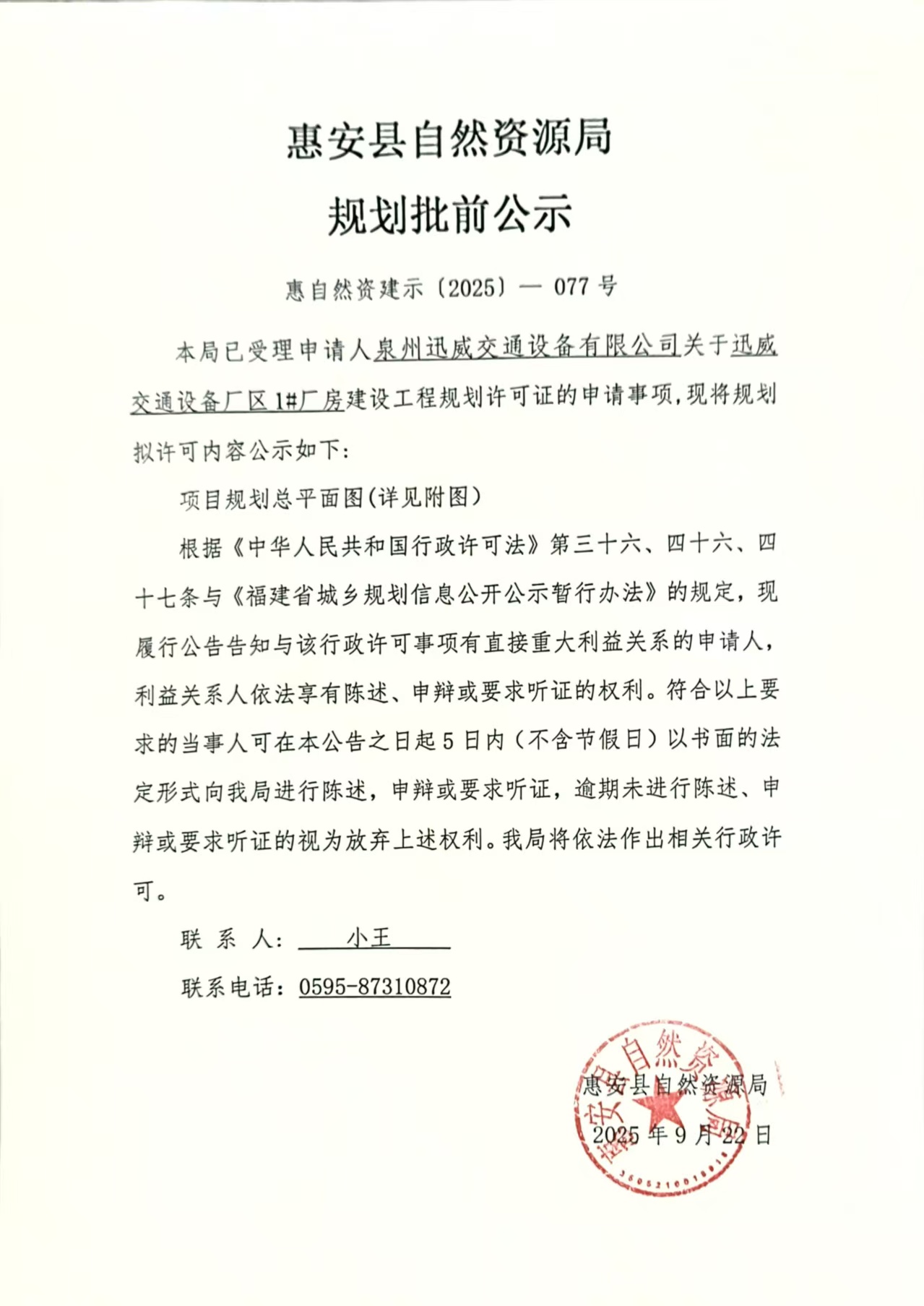迅威交通设备厂区1#厂房建设工程规划许可证批前公示