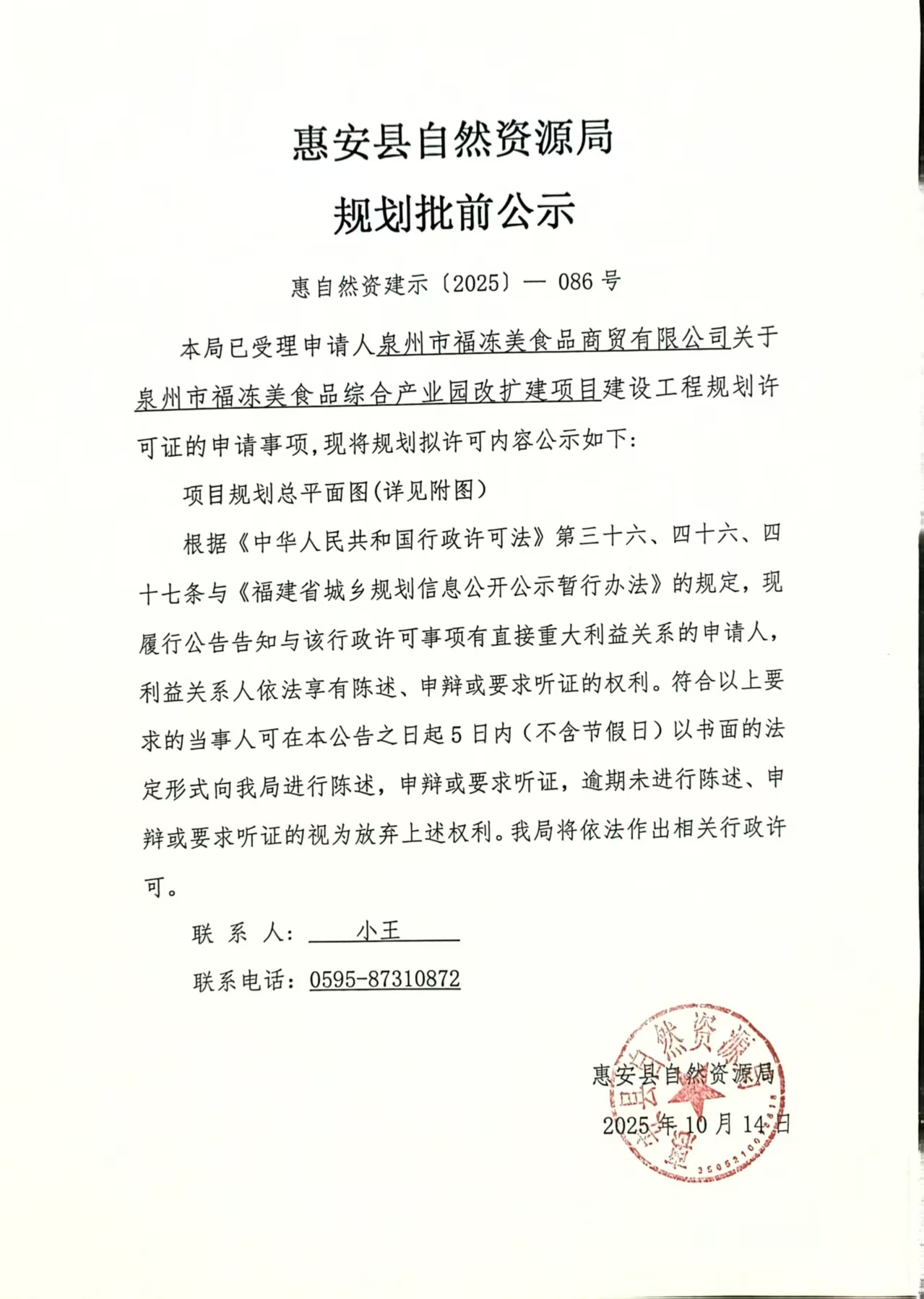 泉州市福冻美食品综合产业园改扩建项目建设工程规划许可证批前公示