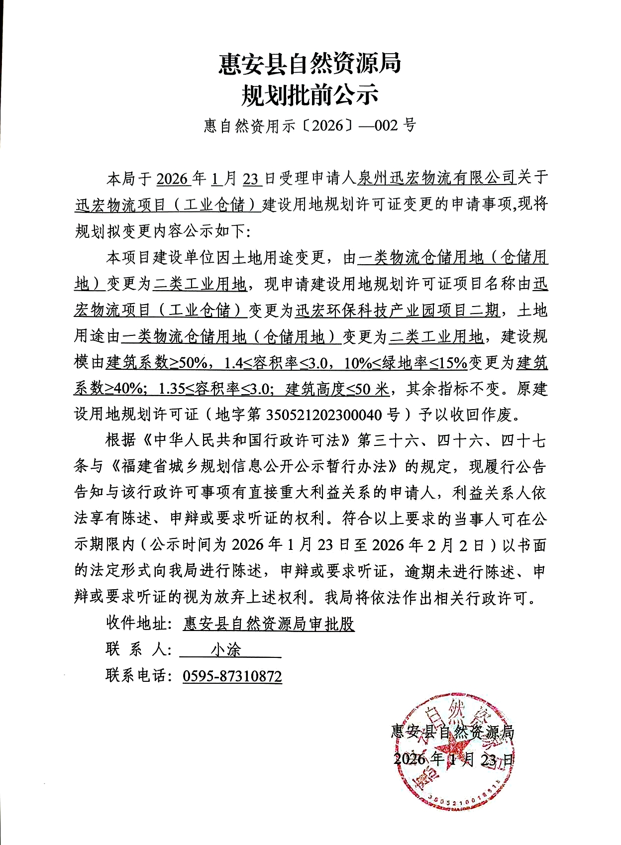 迅宏物流项目(工业仓储)建设用地规划许可证变更批前公示