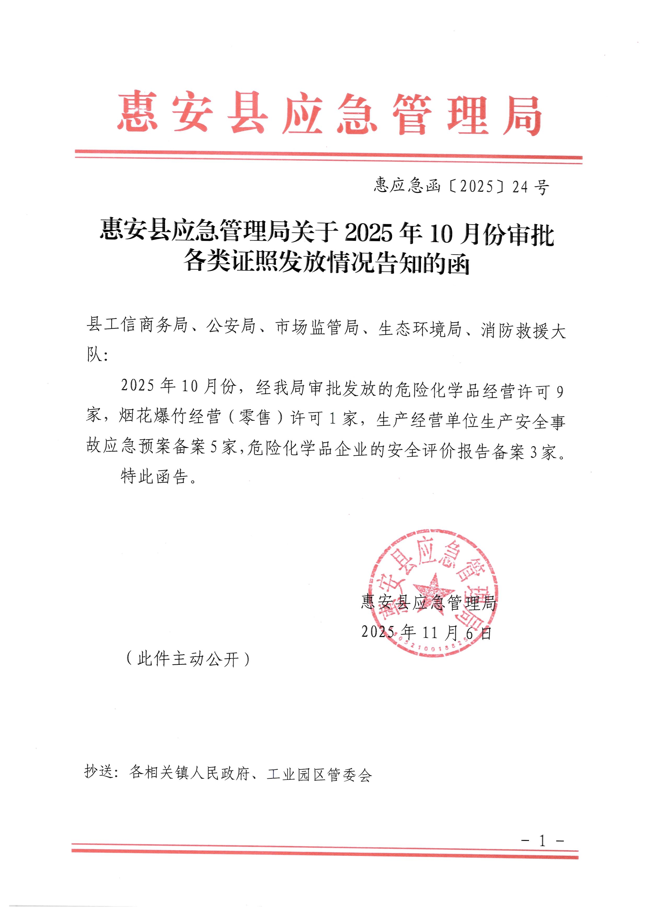 惠安县应急管理局关于2025年10月份审批各类证照发放情况告知的函