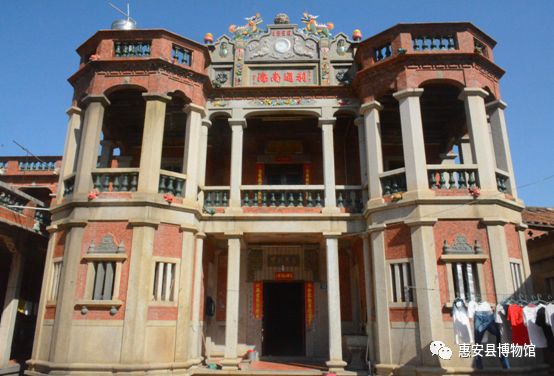 几栋洋楼里,保存最完整的是“适然别墅”。别墅楼顶正面墙上用红色瓷砖贴着“利通南海”四字,正中镶嵌钟表,上塑双狮戏球,五彩斑斓的装饰充满浓浓的南洋味道。别墅大门镶嵌传统青石雕和砖雕,屋顶贴着彩色花砖,屋内开阔明亮。别墅集合了中西建筑风格,美观大方。