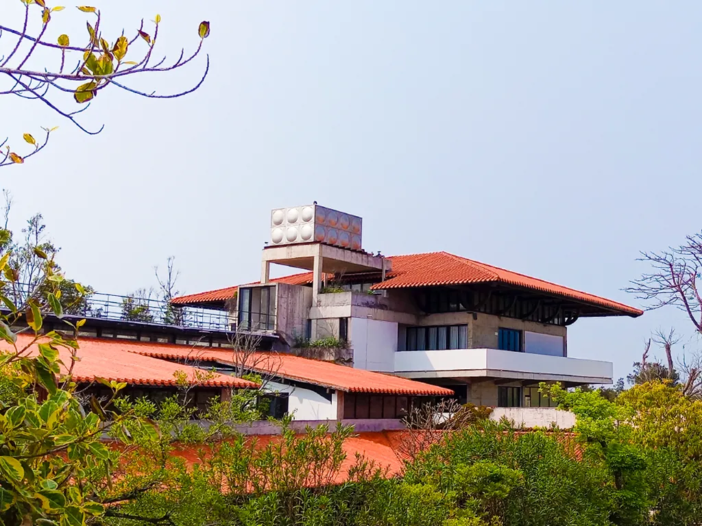 爬上屋顶的观海栈道,映入眼帘的是美术馆两侧屋顶上的“闽南红”瓦片,在碧海蓝天的衬托下显得一片红火,郁郁葱葱的绿树也来“凑热闹”。长长的栈道仿佛直通大海,走到尽头就是最佳观海点,来看看画展、吹吹海风、看看潮起潮落,将蓝天碧海尽收眼底吧!