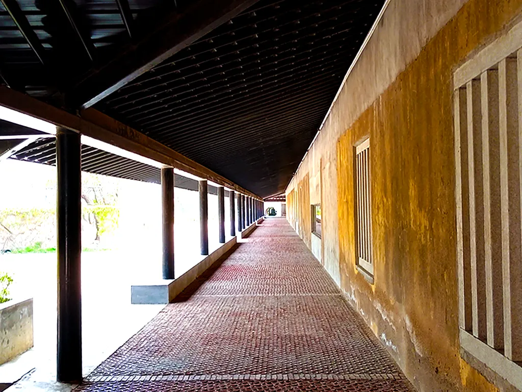 百米风雨长廊纵贯南北场地,海洋元素巧妙地融入到了美术馆设计中,清晨的阳光洒落在此,长廊就像海上泛起的微波,又像红宝石般耀眼的鱼鳞。