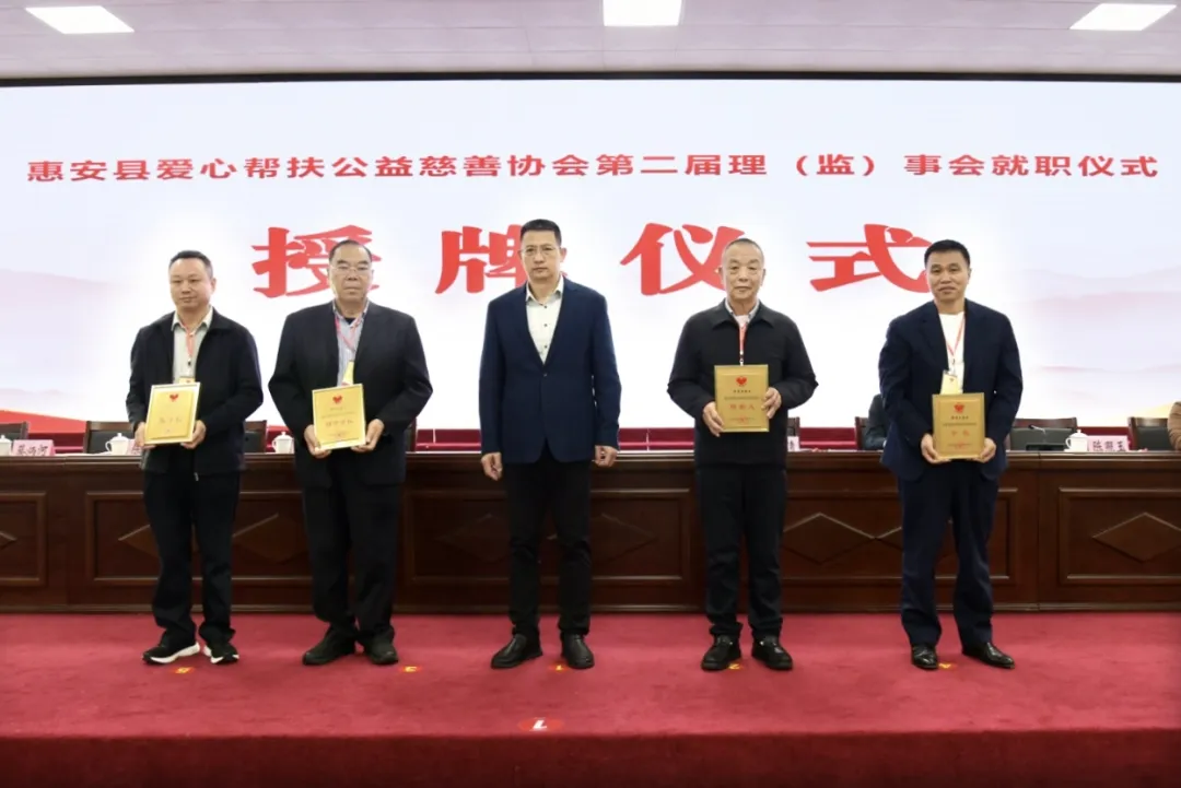 就职仪式上,县委书记庄稼祥为协会创始人、创会会长、第二届协会会长、监事长授牌。现场还举行了中国人民财产保险股份有限公司惠安支公司与惠安县爱?帮扶公益慈善协会合作签约仪式。
