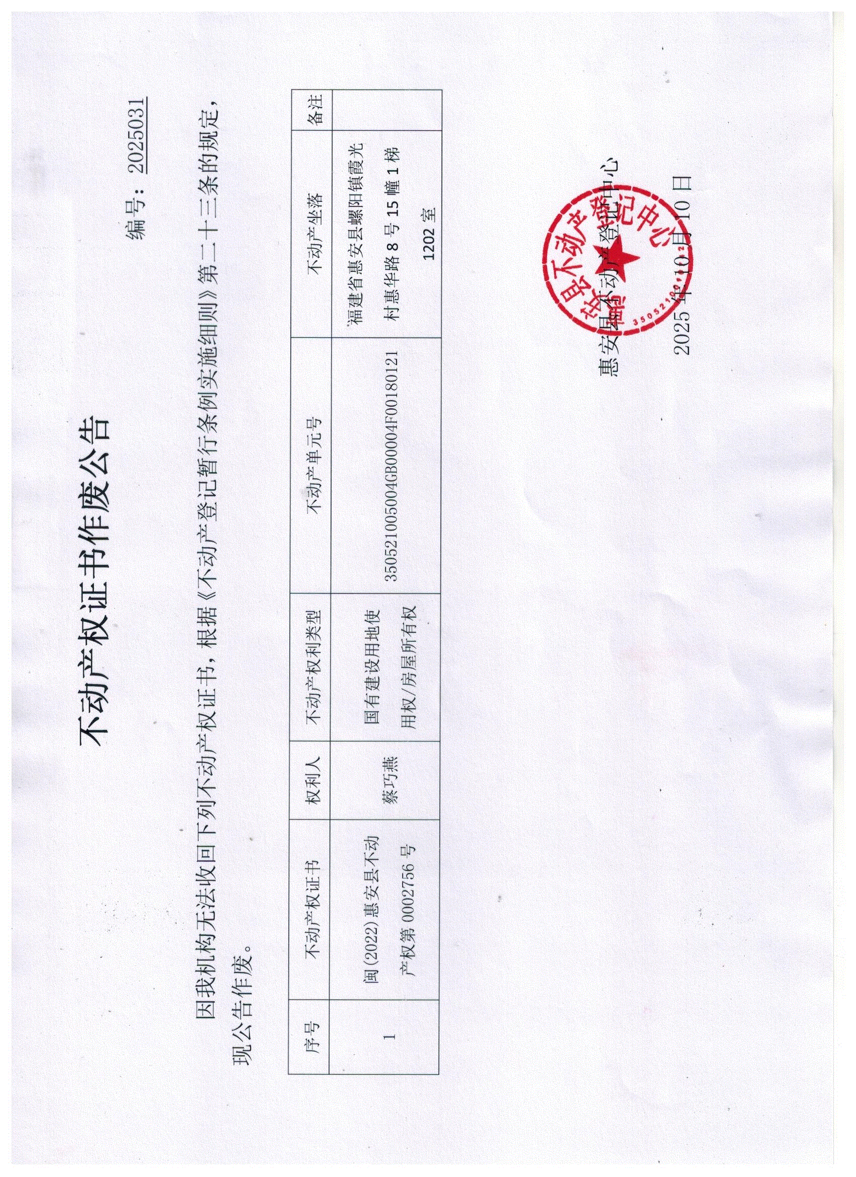 不动产权证书作废公告2025031