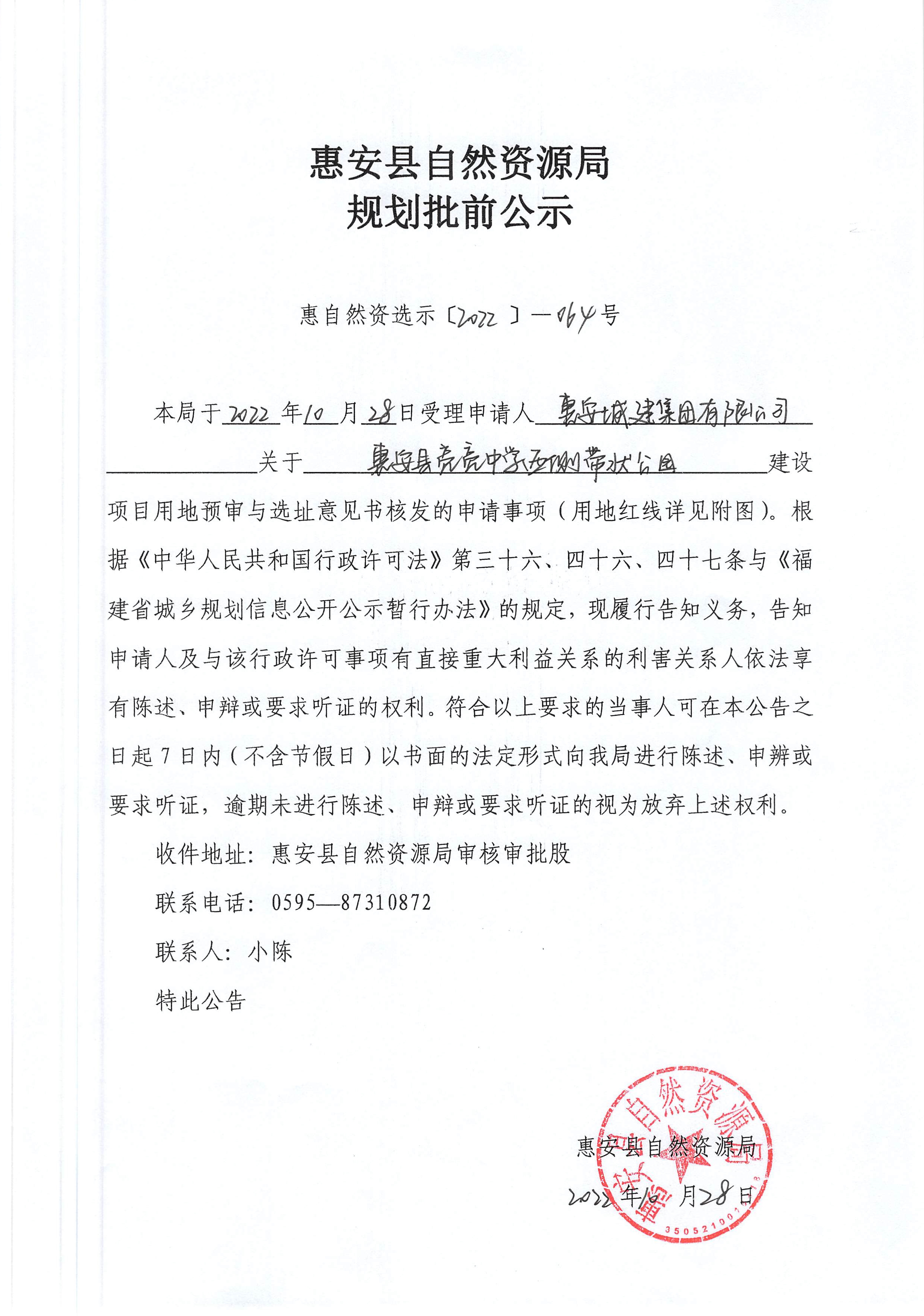 惠安县亮亮中学西侧带状公园 建设项目用地预审与选址意见书规划批前公示