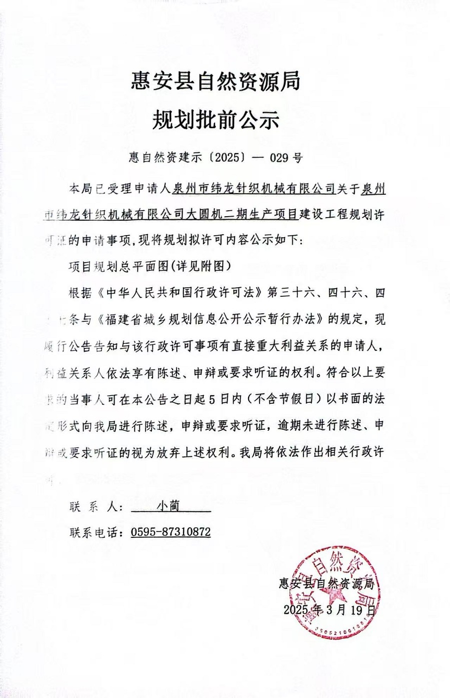 泉州市纬龙针织机械有限公司大圆机二期生产项目建设工程规划许可证批前公示
