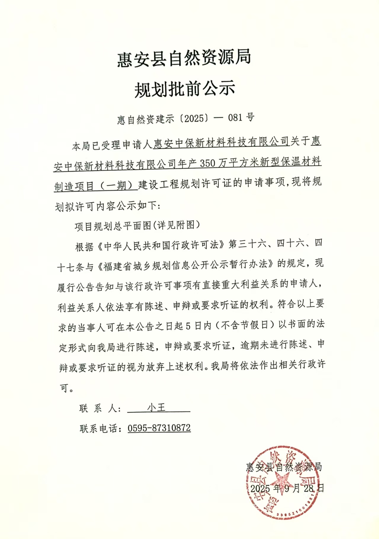 惠安中保新材料科技有限公司年产350万平方米新型保温材料制造项目(一期)建设工程规划许可证批前公示