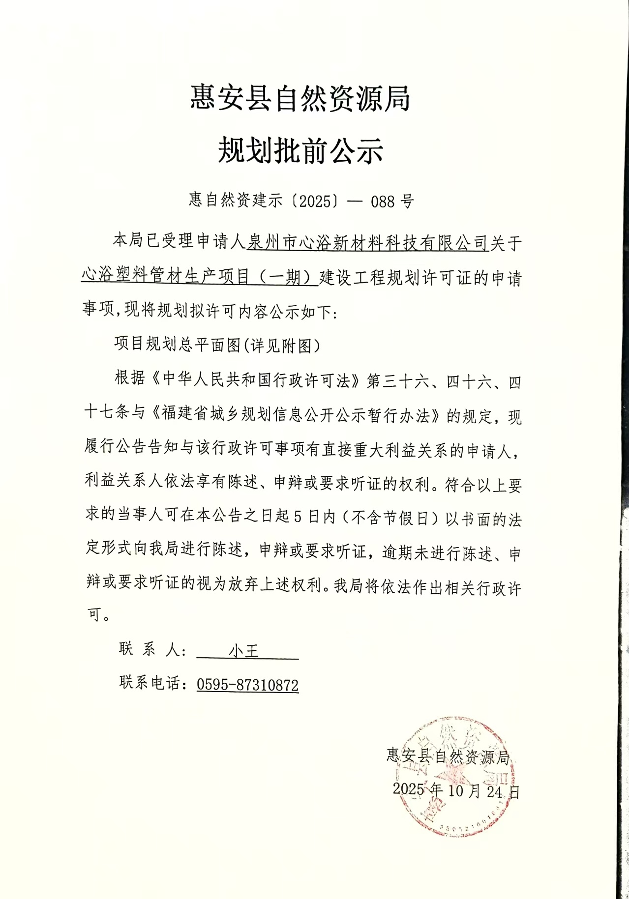 心浴塑料管材生产项目(一期)建设工程规划许可证批前公示