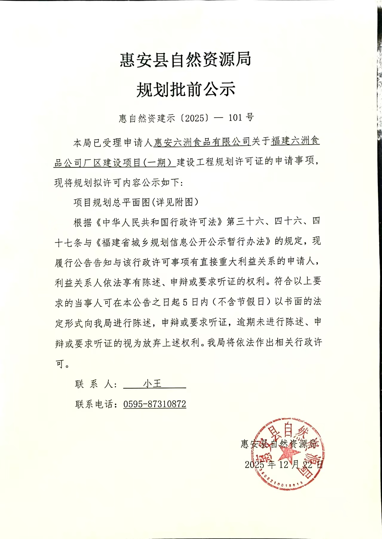 福建六洲食品公司厂区建设项目(一期)建设工程规划许可证批前公示