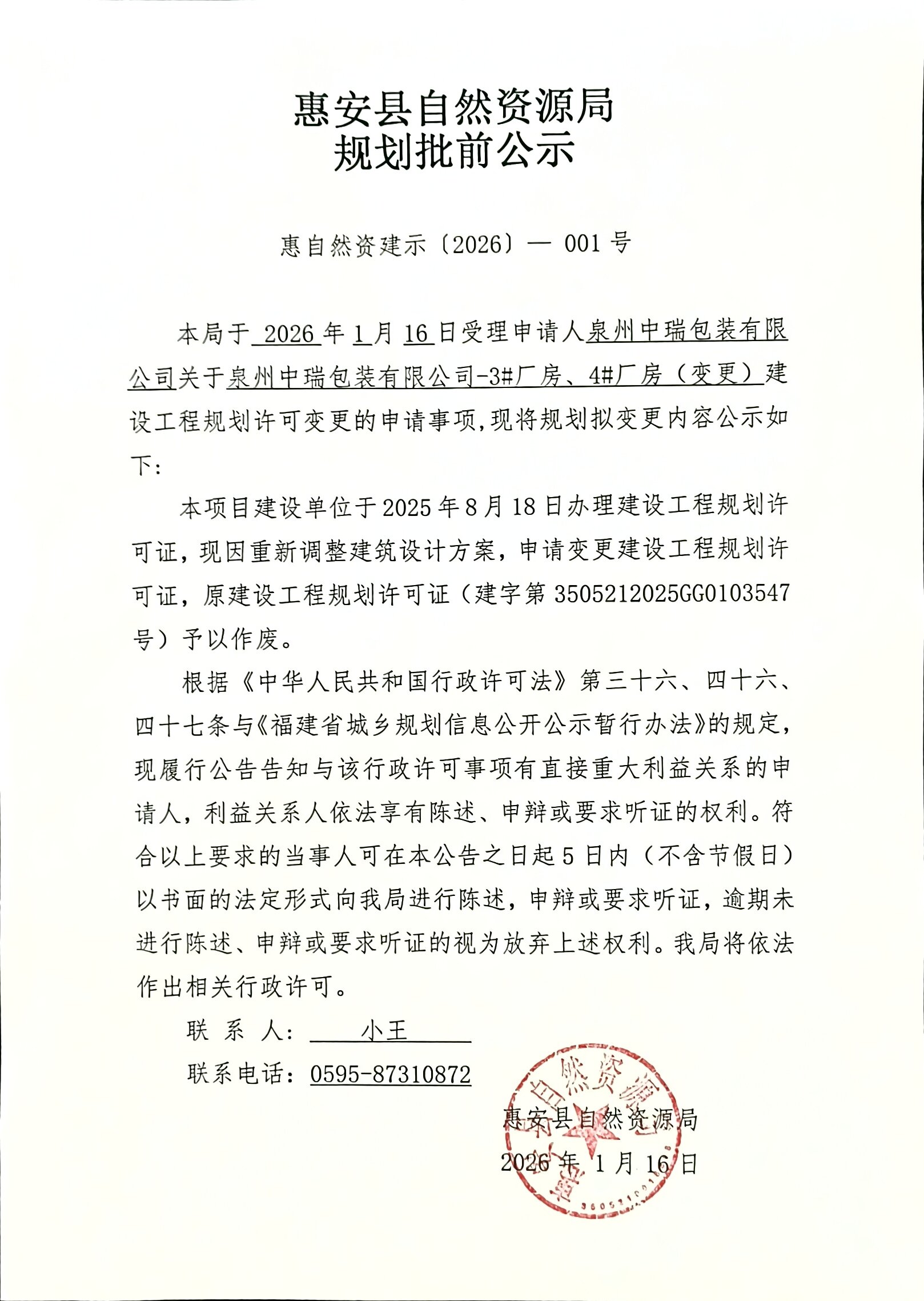泉州中瑞包装有限公司-3#厂房、4#厂房(变更)建设工程规划许可变更批前公示