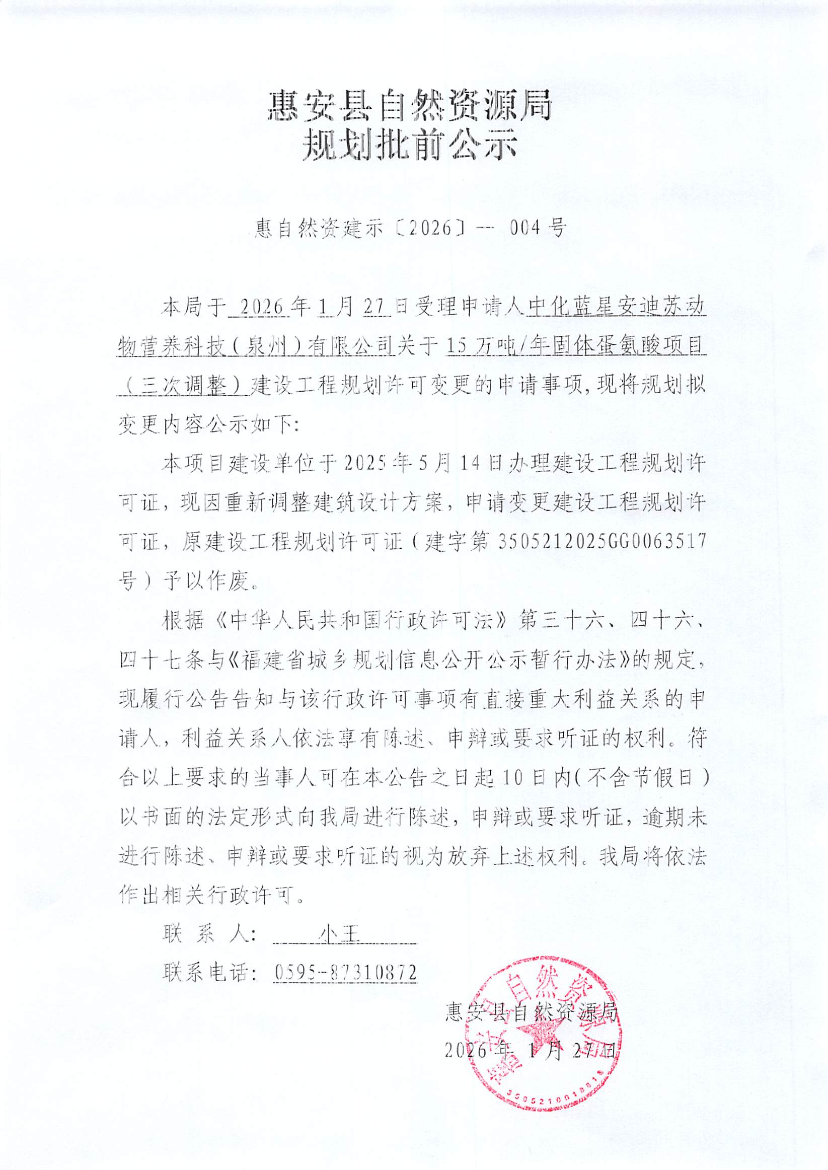 15万吨/年固体蛋氨酸项目(三次调整)建设工程规划许可变更批前公示