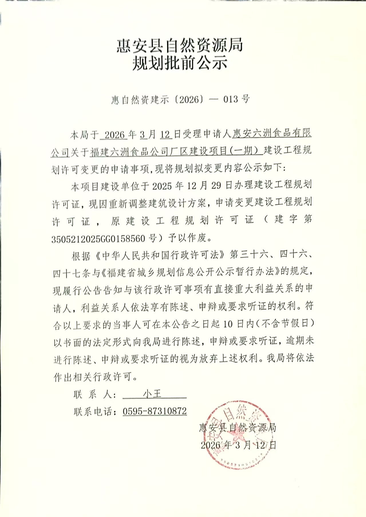 福建六洲食品公司厂区建设项目(一期)建设工程规划许可变更批前公示