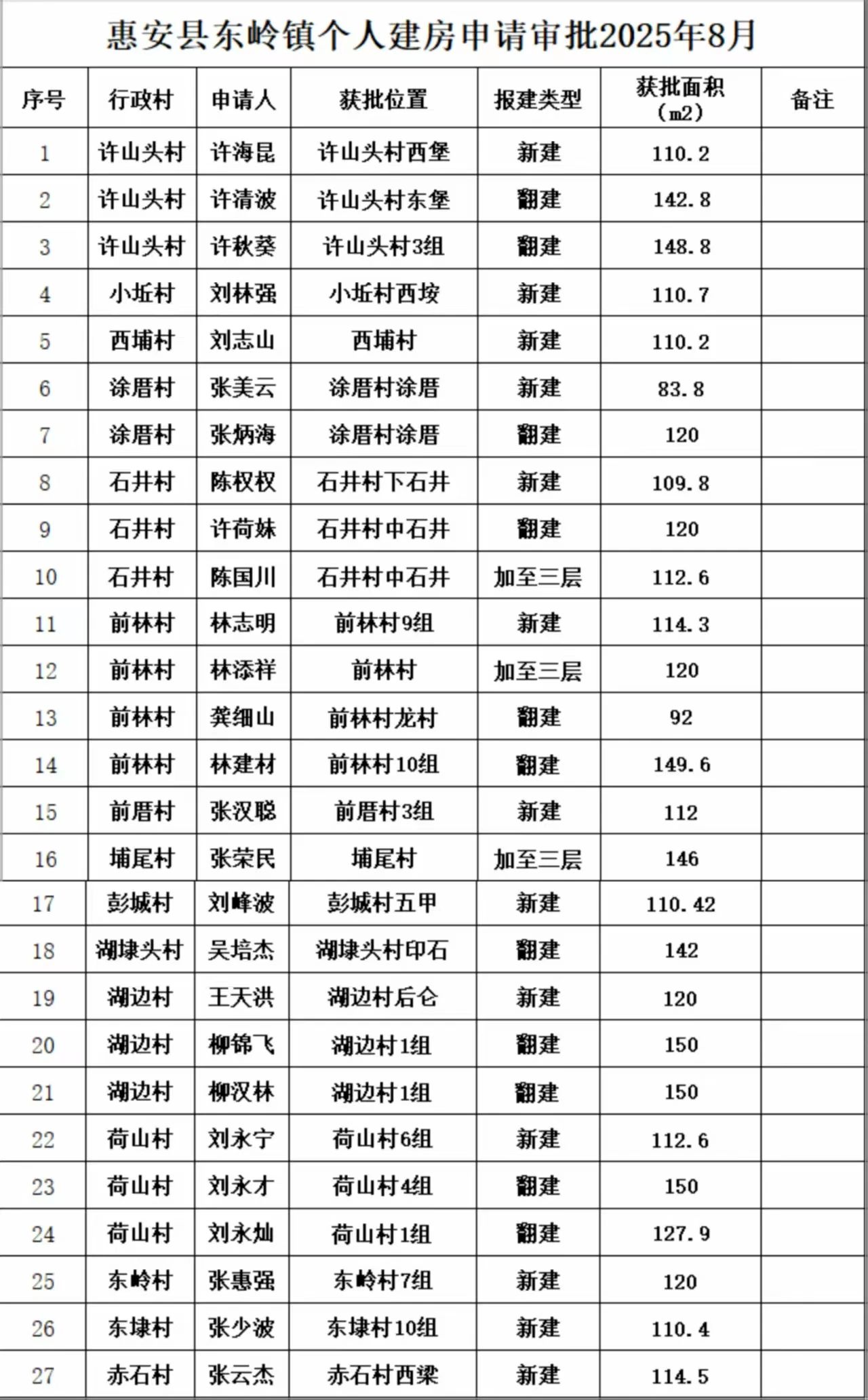 东岭镇2025年8月个人建房审批情况表