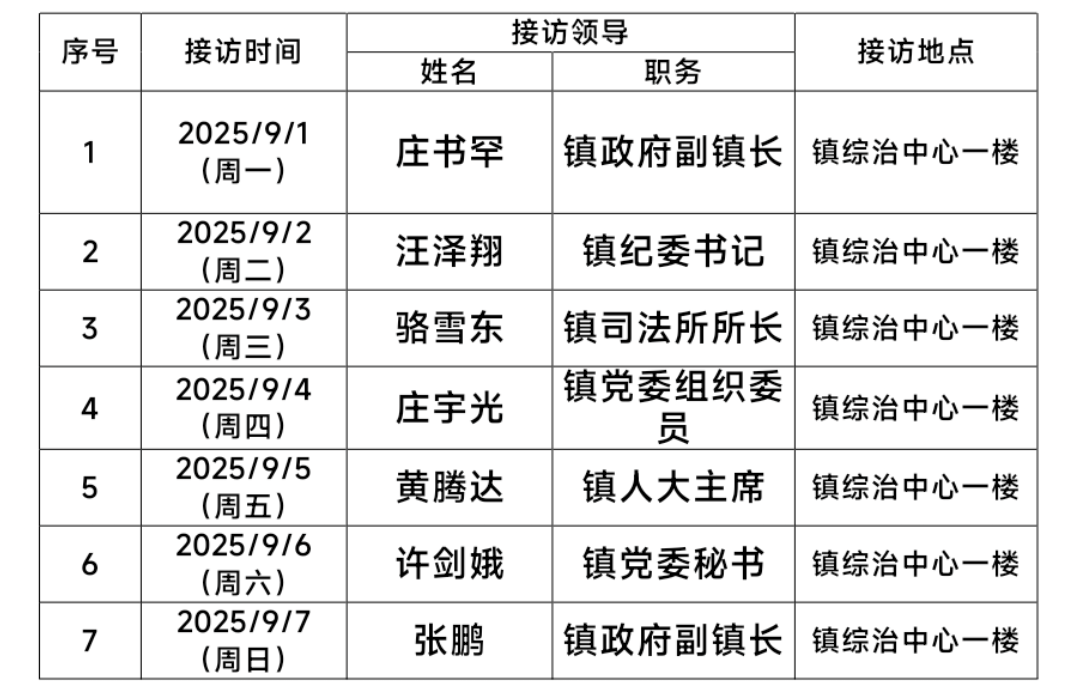 为坚持和发展新时代“枫桥经验”,进一步畅通群众民意诉求反映渠道,及时解决群众急难愁盼问题,扎实推进信访法治化工作,现将东岭镇2025年9月1日至9月7日领导干部公开接访信息公告如下: