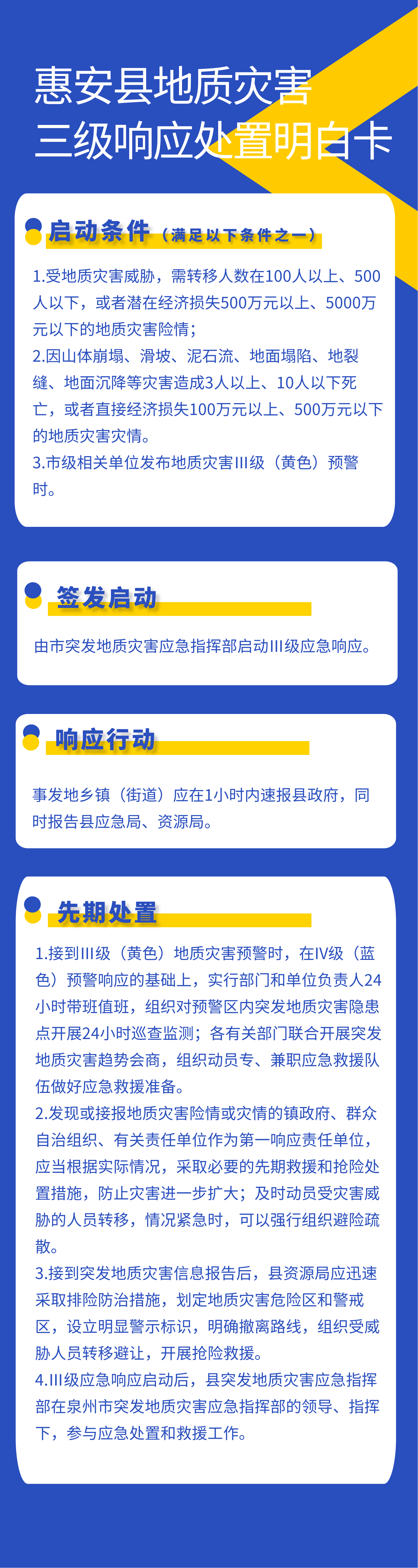 上级发布我县地质灾害气象风险三级预警(黄色)或接到较大突发地质灾害报告经核实的,或者现场处置中确认为较大突发地质灾害的,应急指挥部应立即比照IV级应急响应,组织各相关成员单位和专家组赶赴现场,开展应急先期处置工作,并按规定将地质灾害情况速报泉州市突发地质灾害应急指挥部办公室。