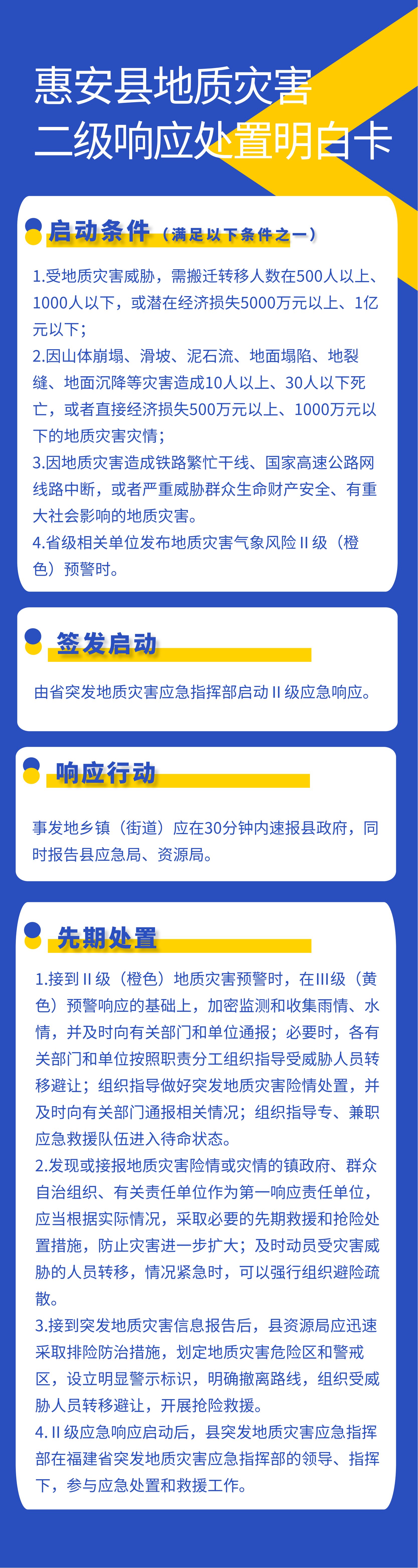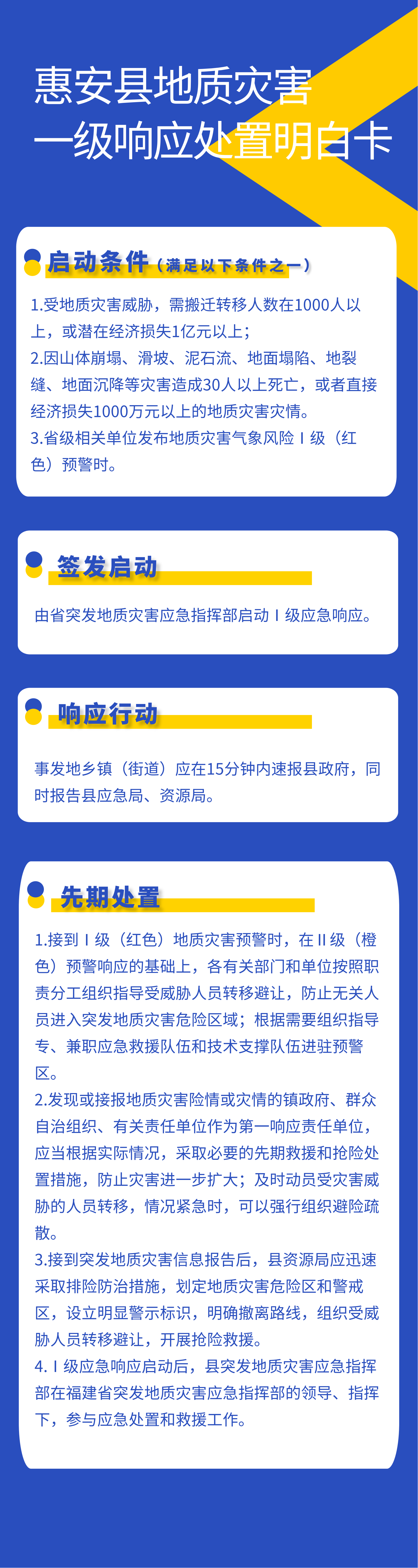 本预案适用于惠安县行政区域内(不含泉州台商投资区)因自然因素或者人为活动引发的危害人民生命财产安全的山体崩塌、滑坡、泥石流、地面塌陷、地裂缝等与地质作用有关的突发地质灾害应急处置工作。