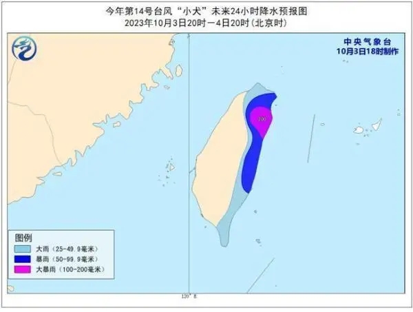 降水预报:3日20时至4日20时,台湾岛东部有大到暴雨,局地有大暴雨(100—200毫米)。