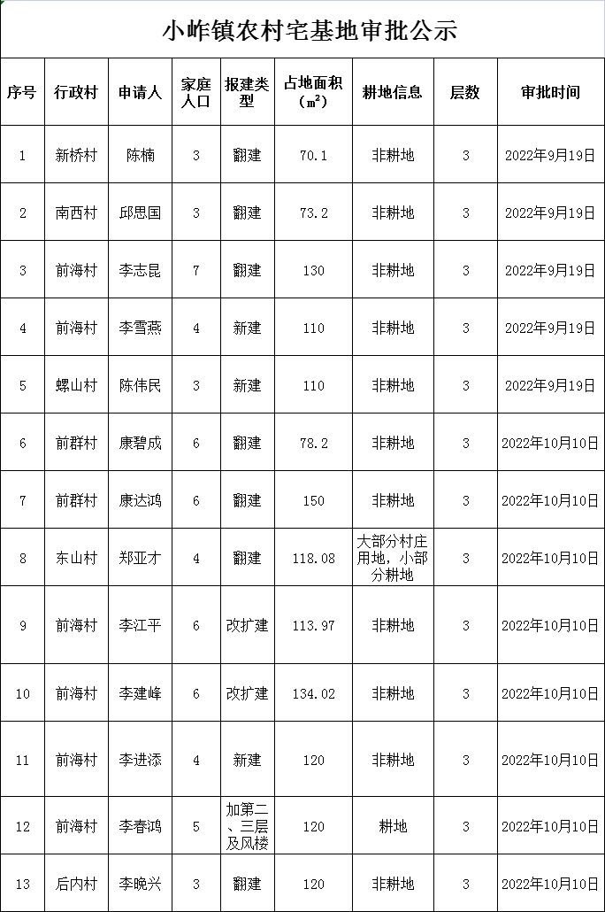 根据《惠安县规范农村宅基地审批建设管理规定》(惠政办〔2020〕60号)规范,按照“农户申请、村民小组讨论、村级审查、窗口受理、部门联审、镇级审批”程序,经村级审核通过,公示无异议,上报镇联审联办审查通过。现将符合宅基地建房审批名单进行公示,如对公示有异议,请向各相关行政村及镇资源所(联系电话:0595-87617592)反映。