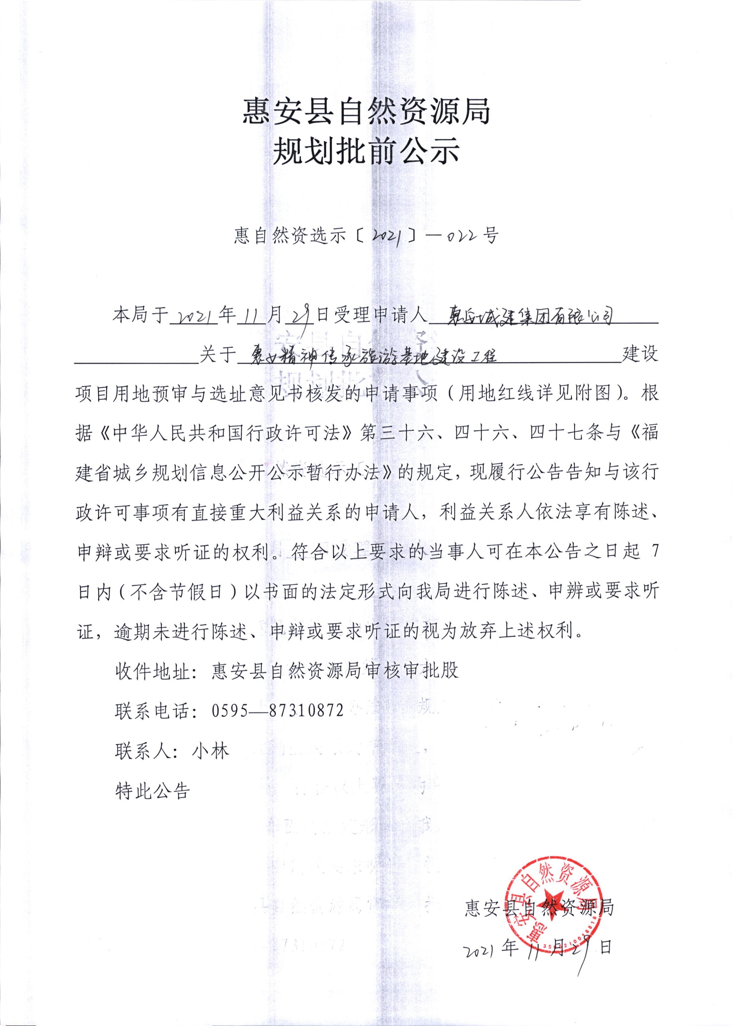 惠女精神传承旅游基地建设工程建设项目用地预审与选址意见书批前公示