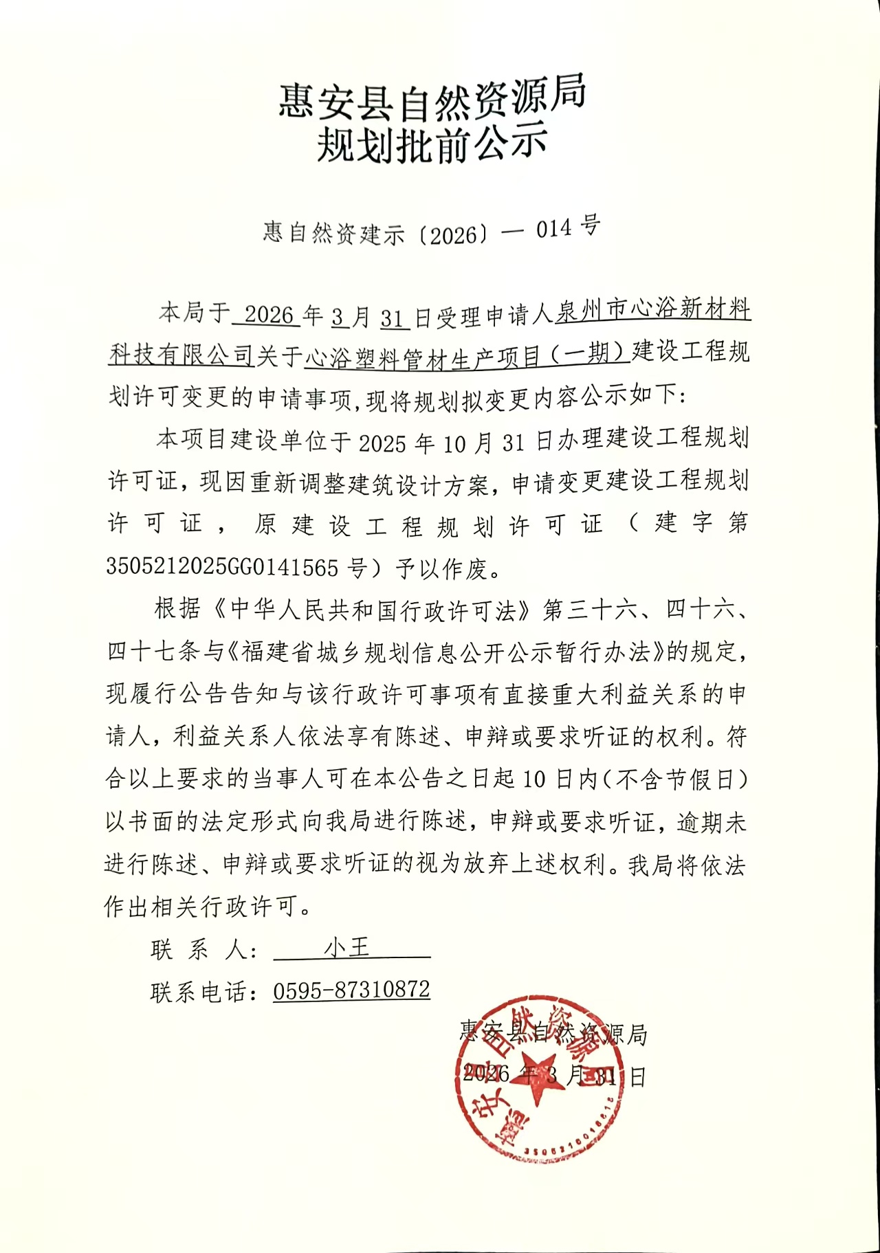心浴塑料管材生产项目(一期)建设工程规划许可变更批前公示