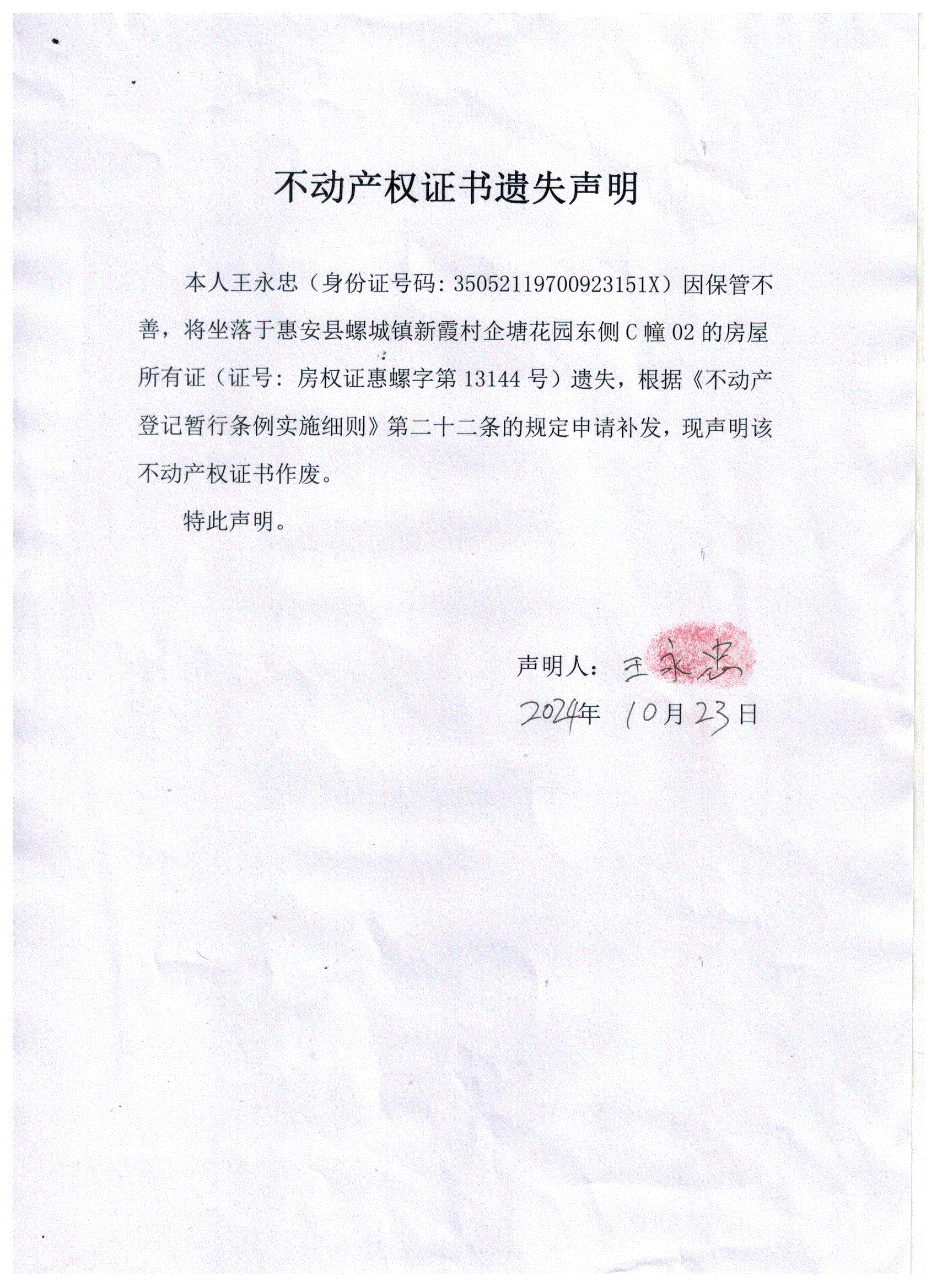 不动产权属证书遗失声明
