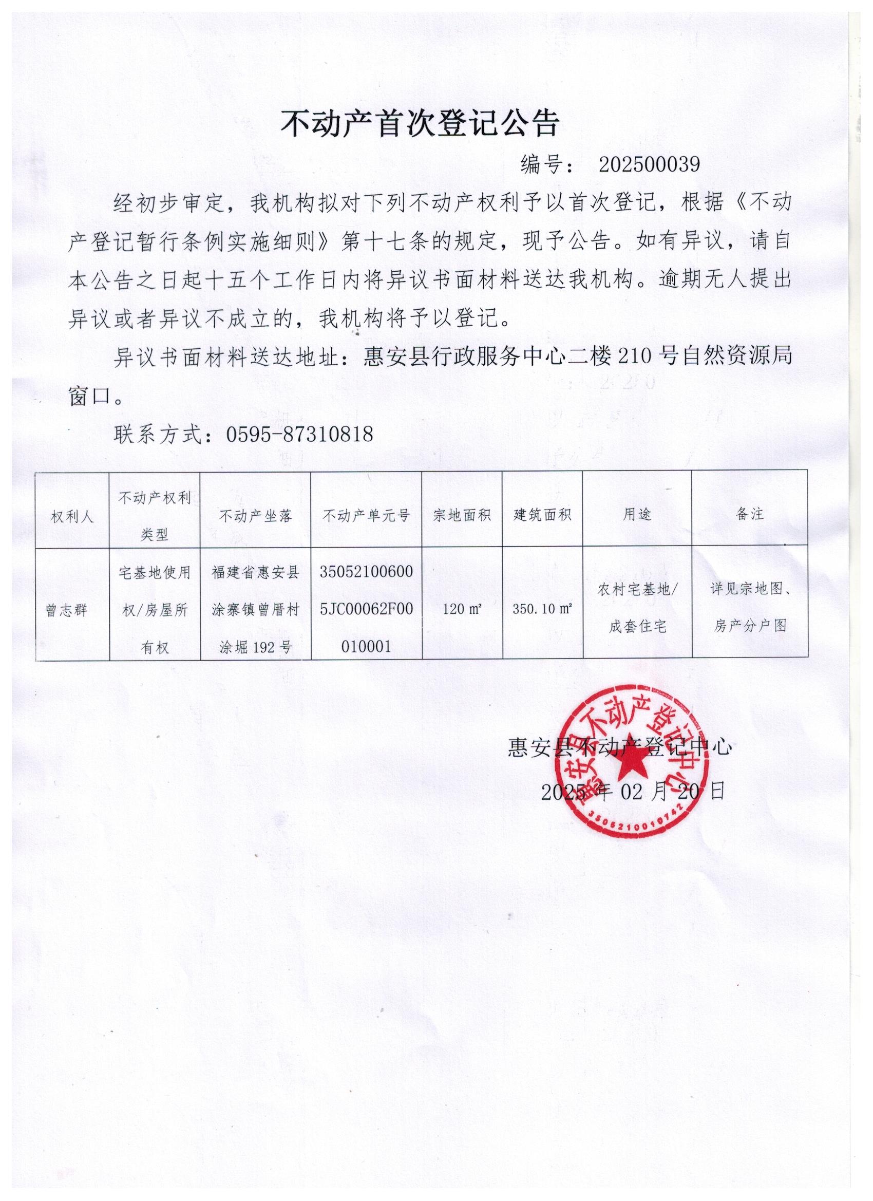 不动产首次登记公告202500039