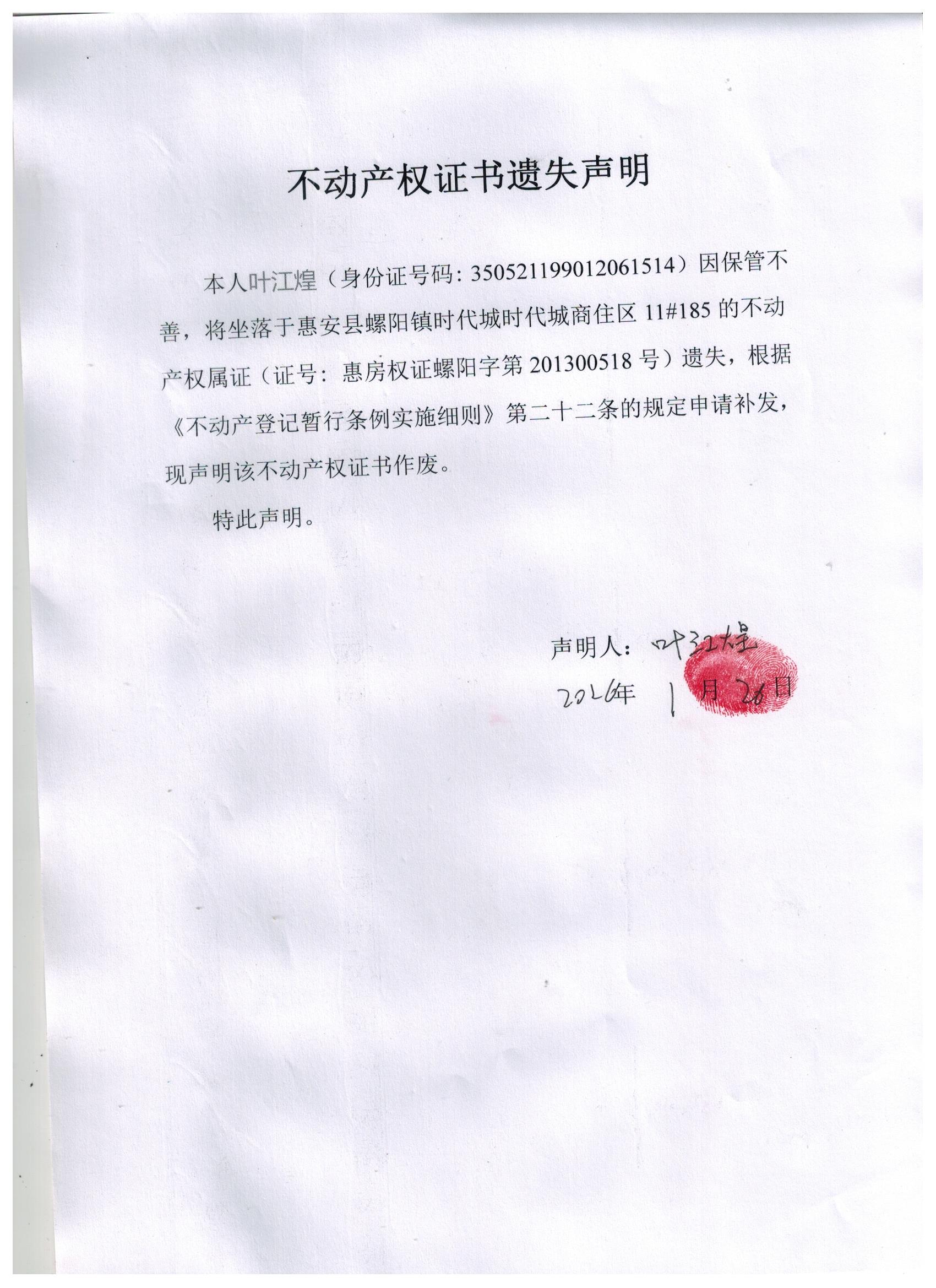不动产权证书遗失声明