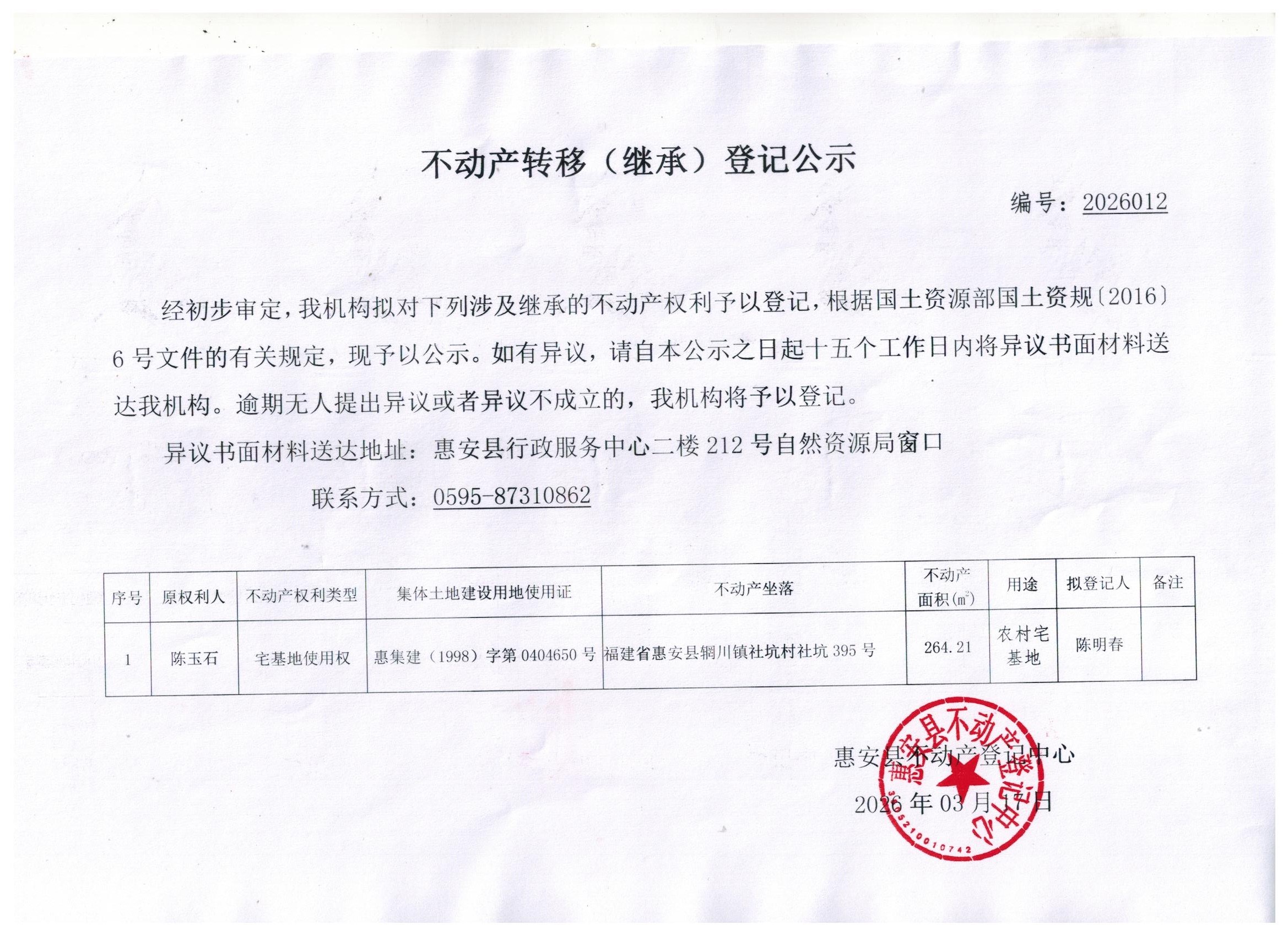 不动产转移(继承)登记公示2026012