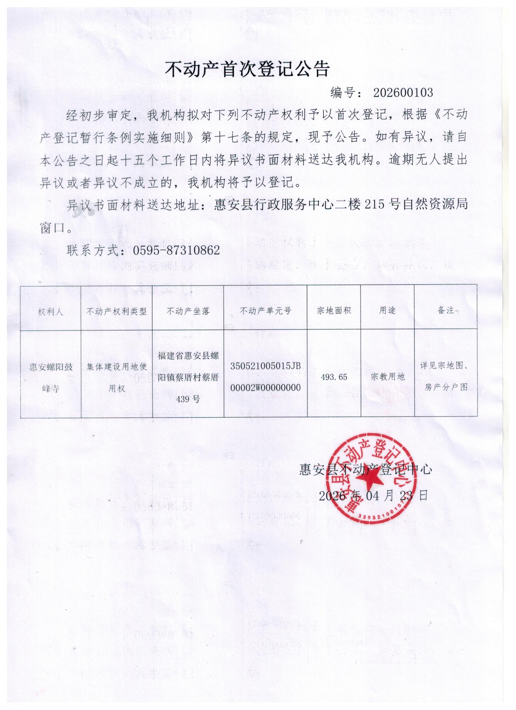 不动产首次登记公告202600103