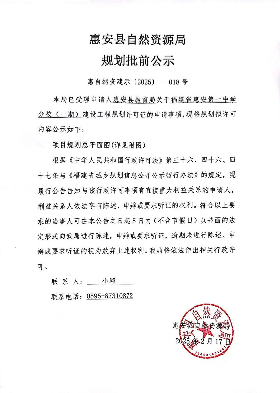 福建省惠安第一中学分校(一期)建设工程规划许可证批前公示