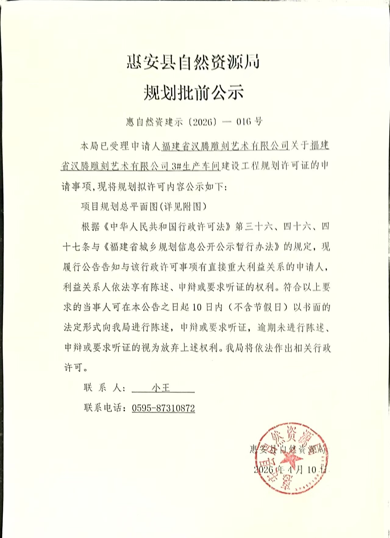 福建省汉腾雕刻艺术有限公司3#生产车间建设工程规划许可证批前公示