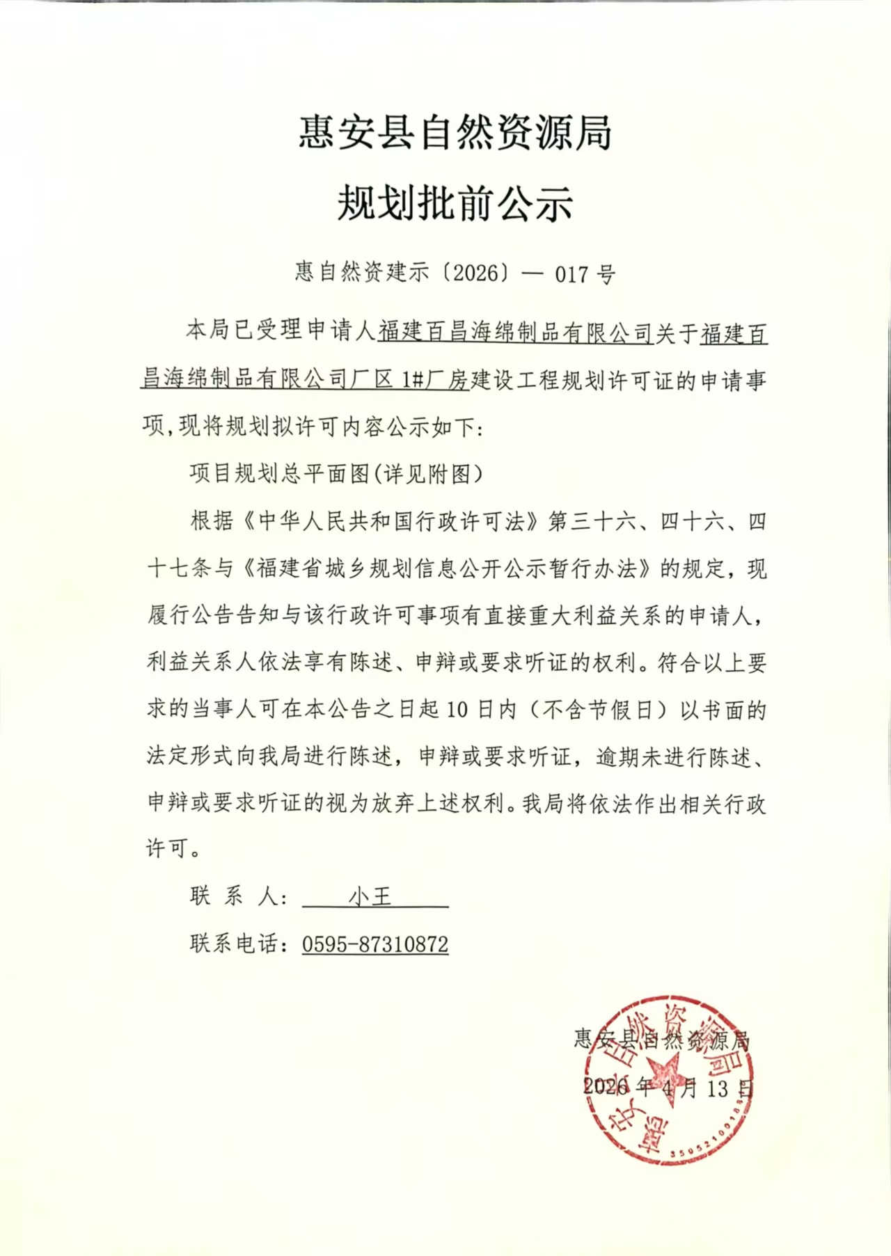 福建百昌海绵制品有限公司厂区1#厂房建设工程规划许可证批前公示