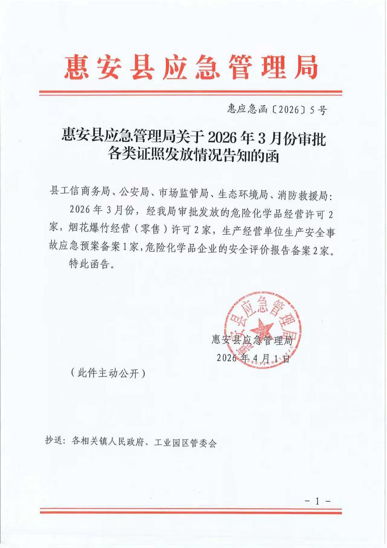 惠安县应急管理局关于2026年3月份审批各类证照发放情况告知的函